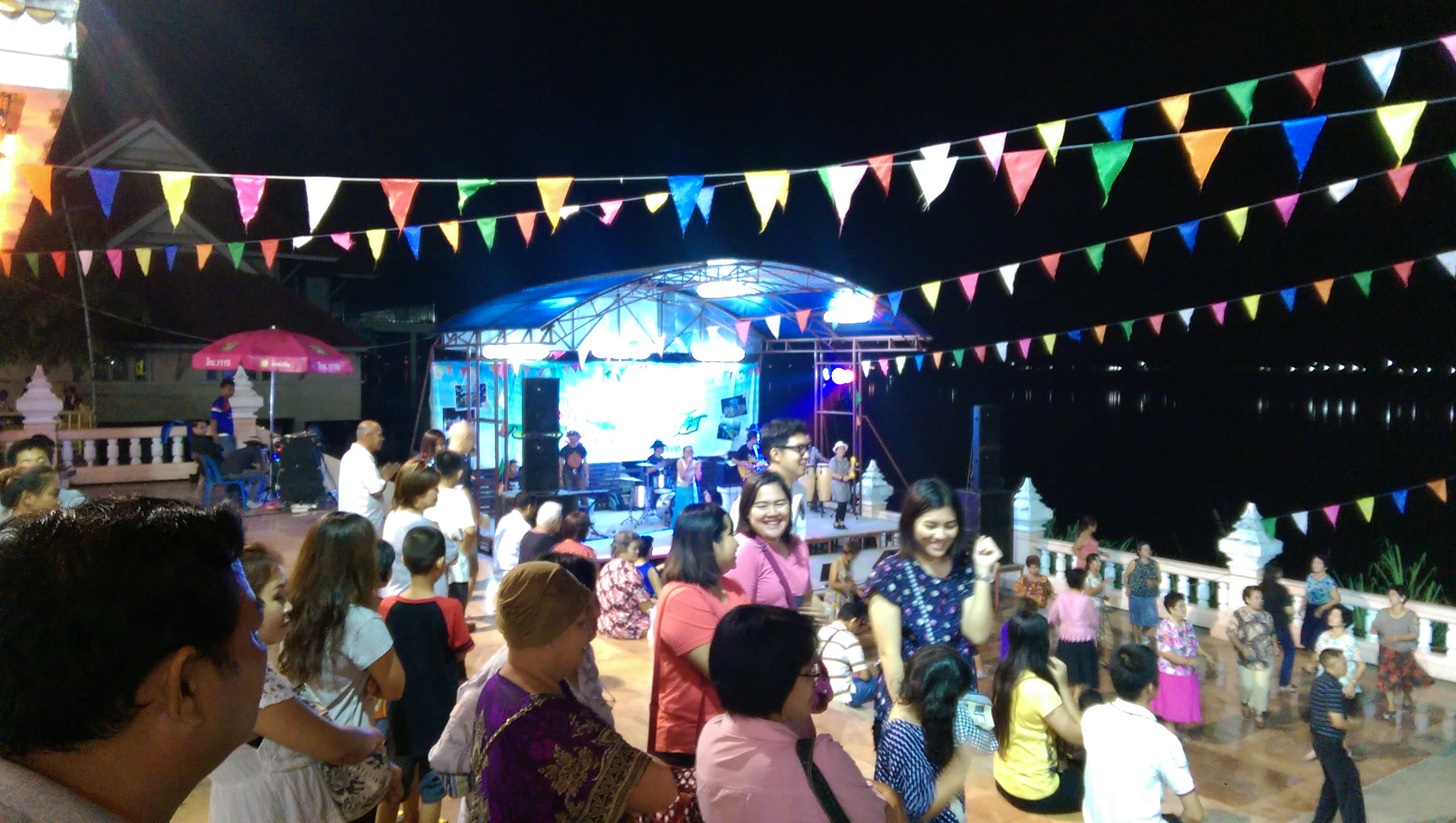 In the afternoon we had noticed a stage being set up on the promenade so after paying the bill we made our way through stalls and stalls of food and gifts to the river. Keeping our eye out for ice cream. As luck would have it a young girl jumped out tempting us to a stall selling fried ice cream. Liam had lemon and Leia and I opted for cookie and cream flavour. It was delicious, cornflakes on the bottom the fried ball of ice cream then drizzled with sauce and sweets. We couldn’t get enough of it. With big grins on our faces we went over to the stage to watch Thai people do their version of a barn dance. Crazy country music blared out over the river while they danced in sync with each other. It looked really fun but even a man insisting we dance couldn’t get us down there, our bravery would need to be built up.