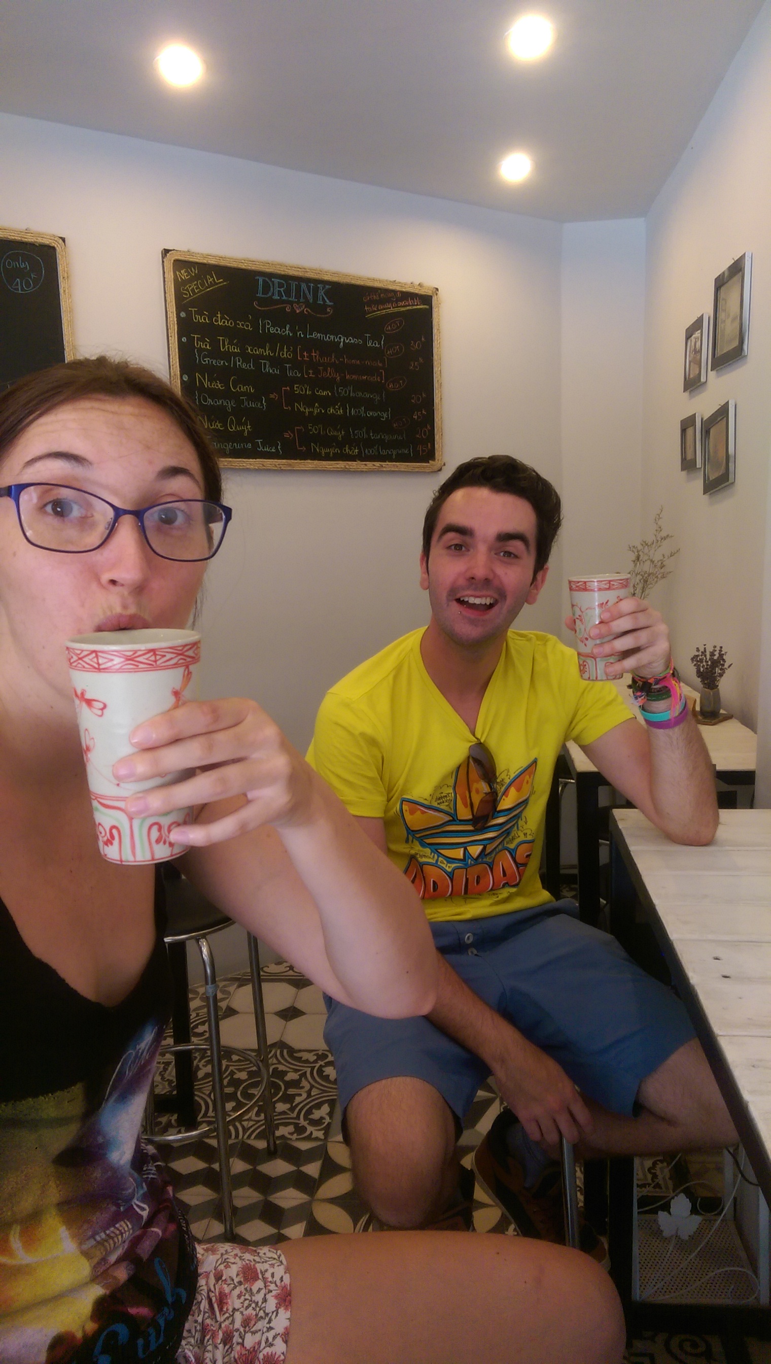 After enjoying the cultural side we needed food, and found a lovely little place selling banh my, which is just bbq pork in bread. We got pulled pork with a slightly spicy sauce and it was so tasty. Just what we needed. Liam had freshly squeezed OJ, Leia had a Vietnamese coffee with condensed milk, and I had a peach and lemongrass tea. All were very yummy.