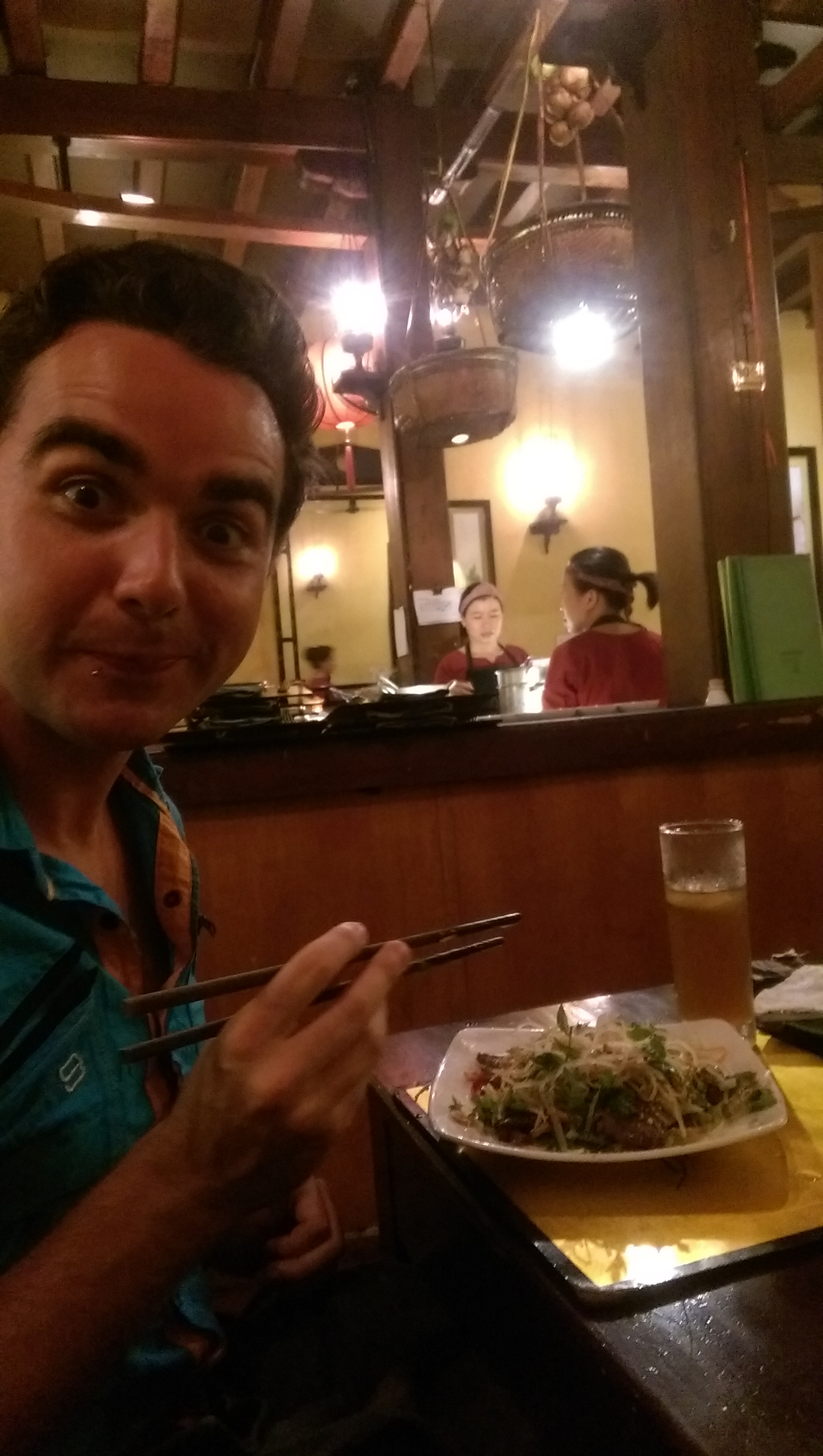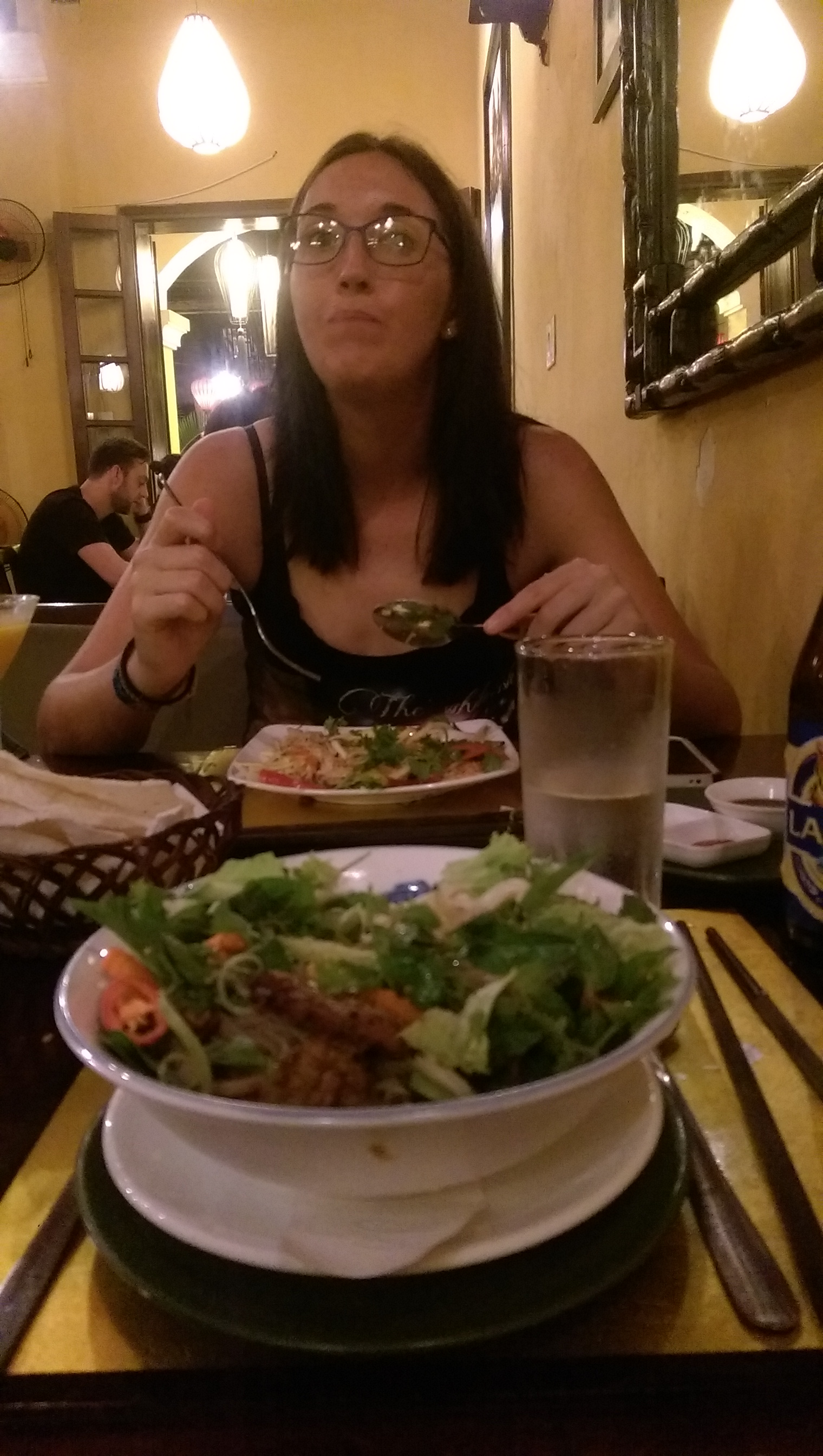 We enjoyed the scenery as we walked over to the restaurant, sat down and perused the menu. It was only slightly more expensive than previous places so Leia and Liam ordered cocktails while I stuck with beer. Starters arrived and they were huge. Liam had crispy wantons topped with all manner of salad and sauce. Leia went for DIY pork skewers where you added leafy greens and wrapped them up in rice paper. I went for Banh Xeo, shrimp and pork eggy pancakes with bean sprouts in the middle, again you got rice paper and leafy greens and you wrap these up into spring roll type things to.