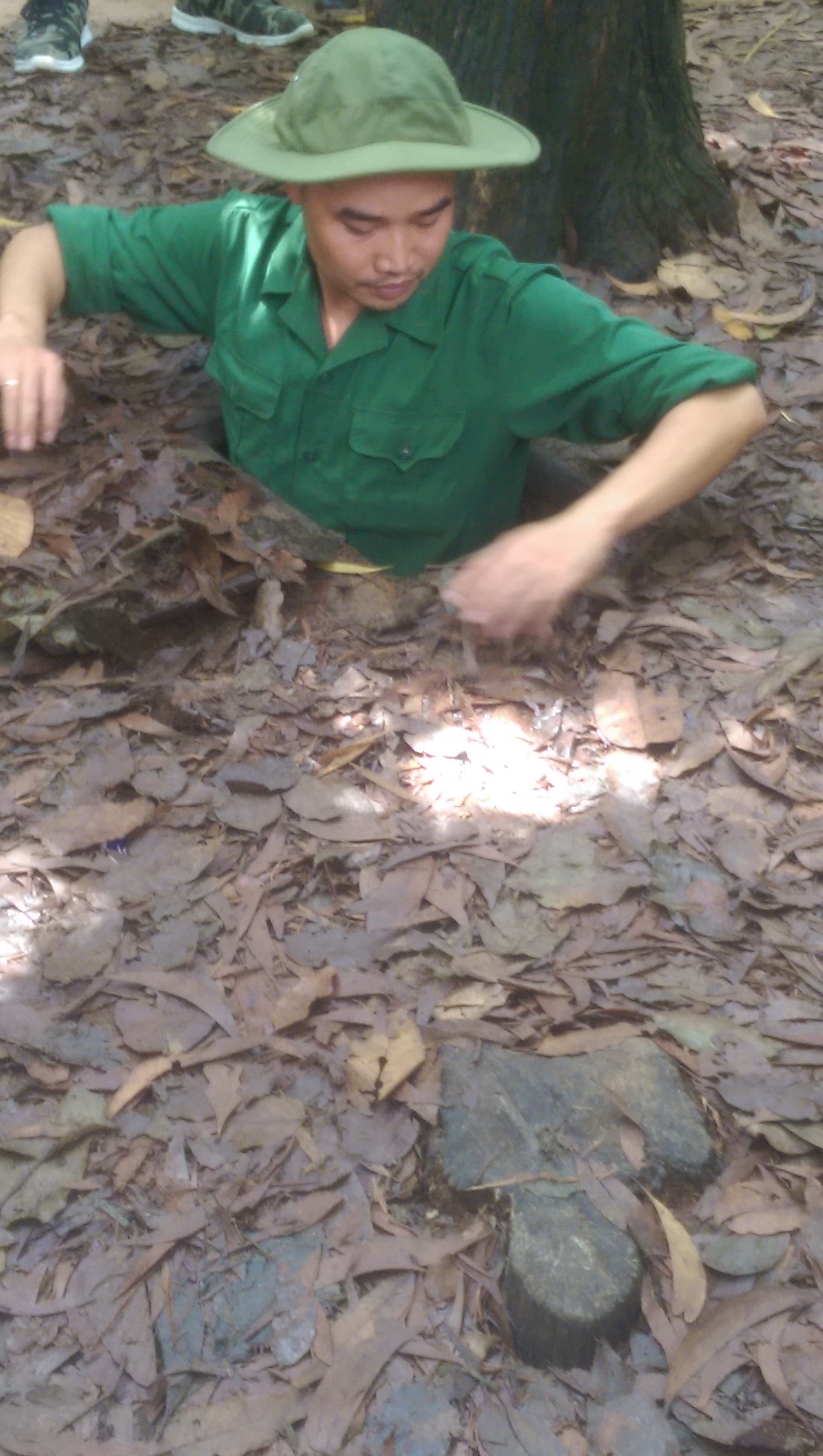 First up on the tour was a video explaining more about the war and why the communists lived and fought in this area. As we were watching we could hear shooting in the distance. Then we were taken to a hole in the ground where north Vietnamese would hide and ambush the enemy. We could get in the hole if we wanted and I jumped at the chance, hopping down into the hole it was pretty snug and I got to hold the wooden camouflage board and sink down till I was hidden in the cubby hole.