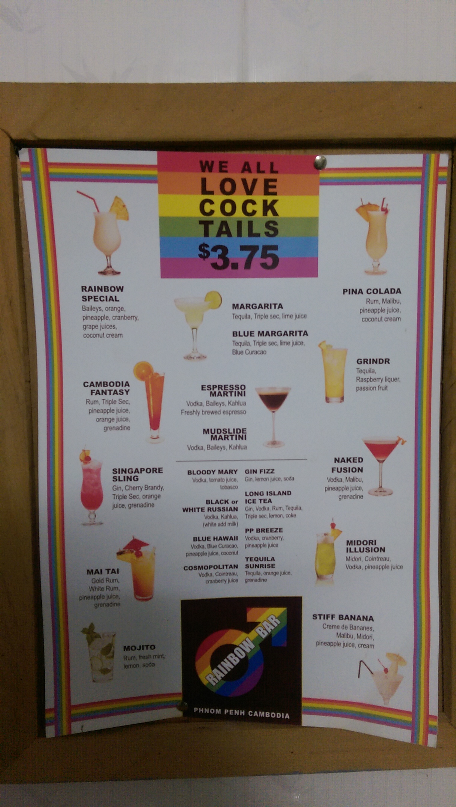 We had read that there was a gay bar in Phnom Penh and it was only a few minutes walk away, so we paid the nice owner of the pizza place and walked to rainbow bar. It was dead, the only people there were staff, but we couldn’t see anywhere nearby and sat down outside now the rain had ceased.