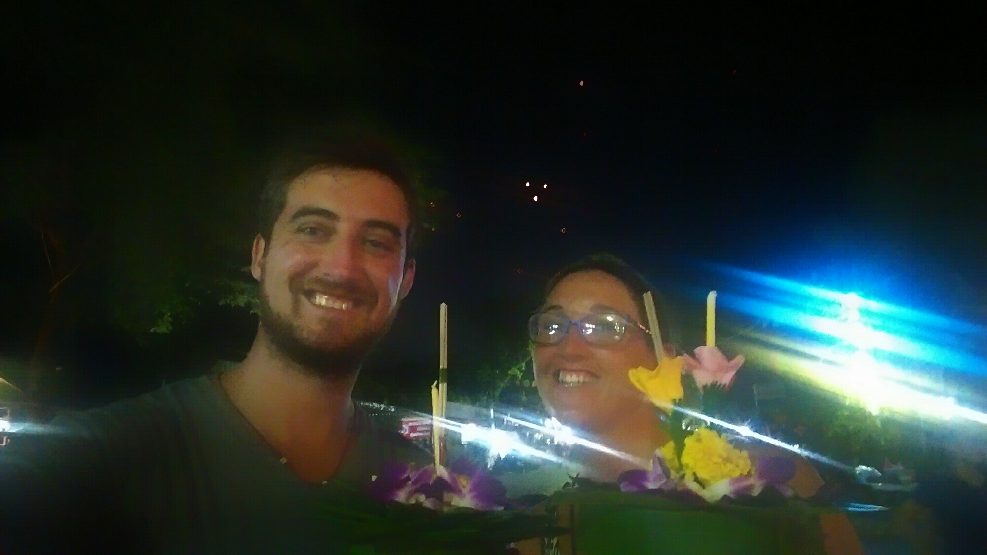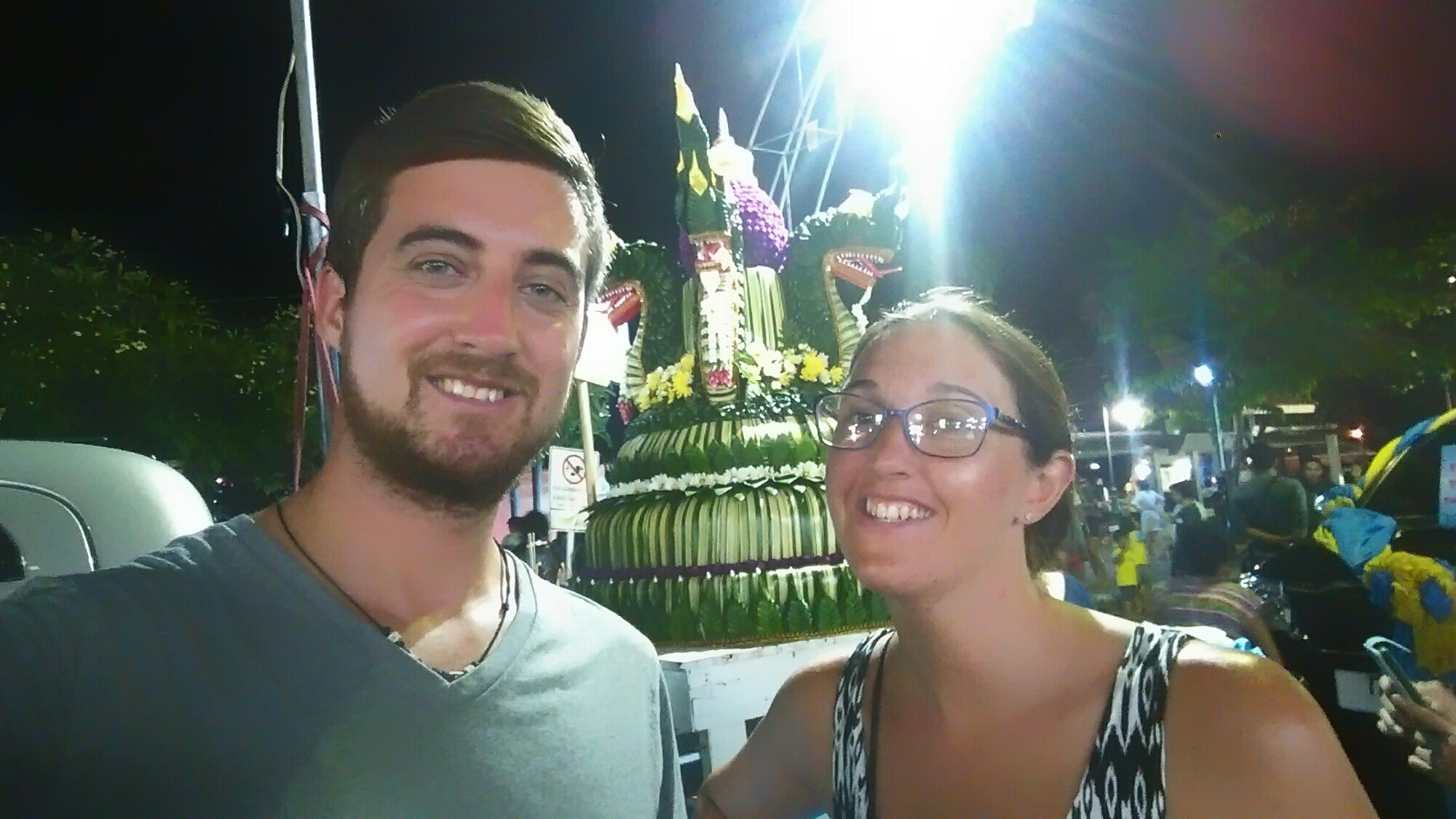 It was huge, a hundred times bigger than Koh Samet’s version. There were people everywhere selling flower arrangements with incense and a candle which you light and send down the river. We bought one each and a few cans of chang strolling past various food, drink and dessert carts. I wish we hadn’t eaten as there was so much that looked good, and there were chinese lanterns lighting up the sky like hundreds of fireflies.
