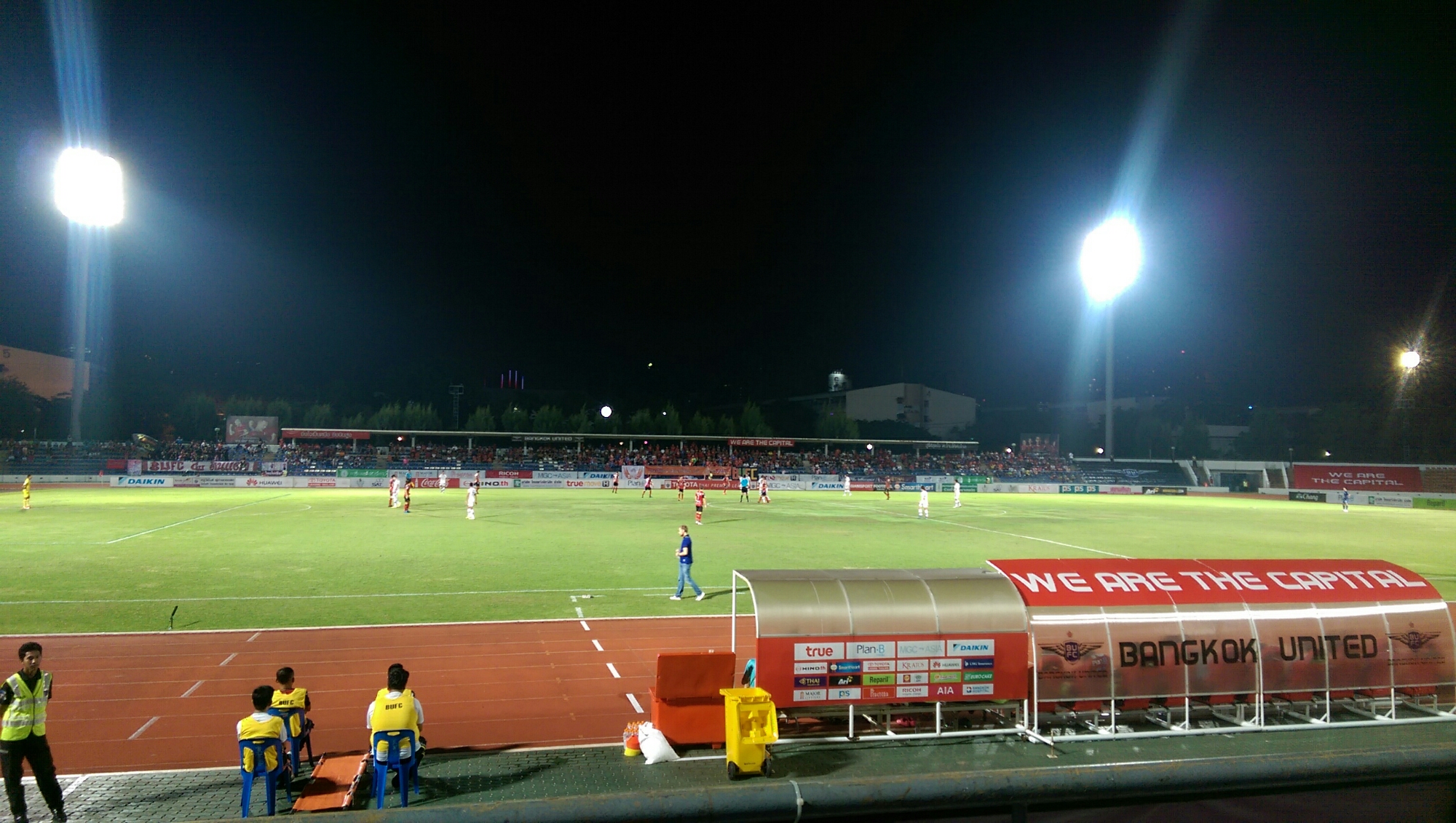 We were dropped off at khao san road and did some last minute shopping. Getting some new tops ready for a night out later. Once we were sufficiently sweaty and hot we jumped a tuk tuk to a nearby sky train and headed over to Sala Daeng station. We planned to watch Bangkok Utd at their stadium which started at six, but the skytrain was delayed, we had to check in to our hotel and then get to the stadium! In the end we took a taxi which cost £4 for a half hour journey and made it to the Thai-Japanese stadium up by the victory monument and were only ten minutes late. It cost 150baht or £3 for a ticket, the stadium was pretty small but it was fun! Bangkok Utd were already 1-0 up and had some vociferous fans opposite us waving huge flags and banging big drums.