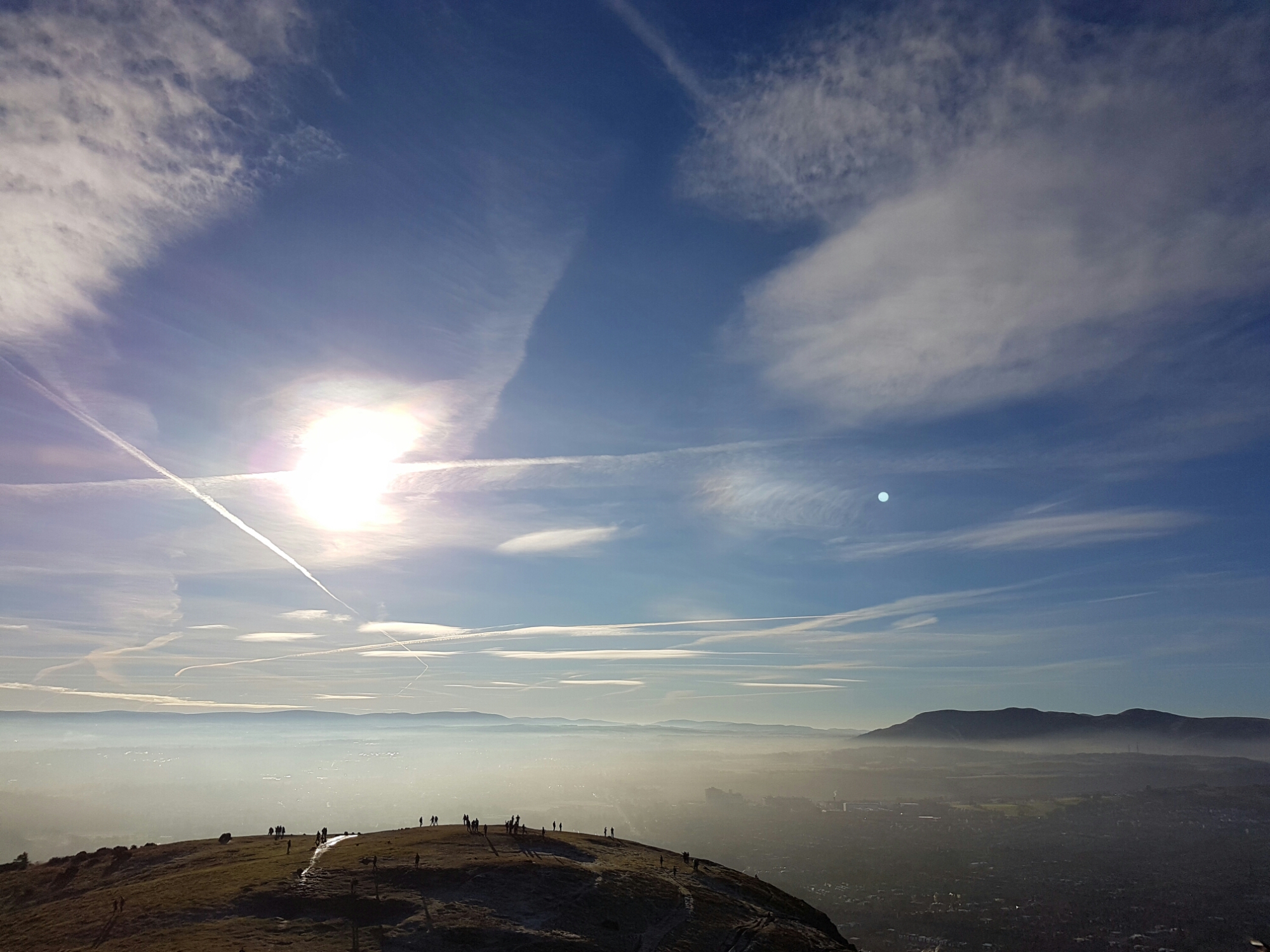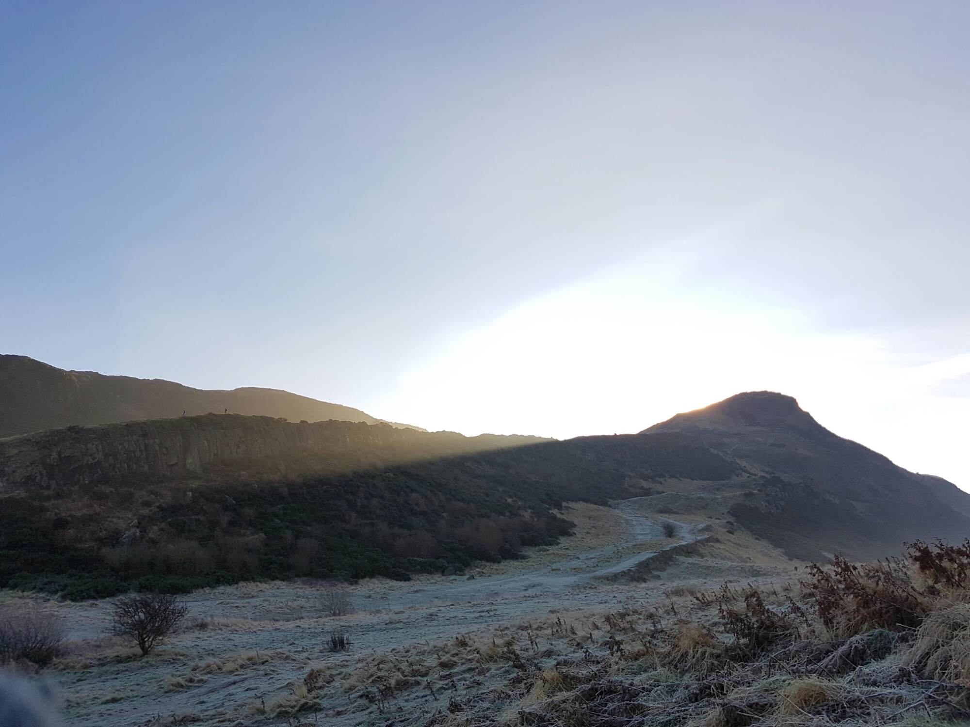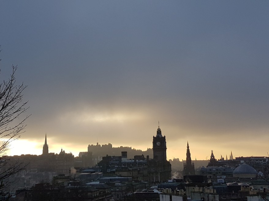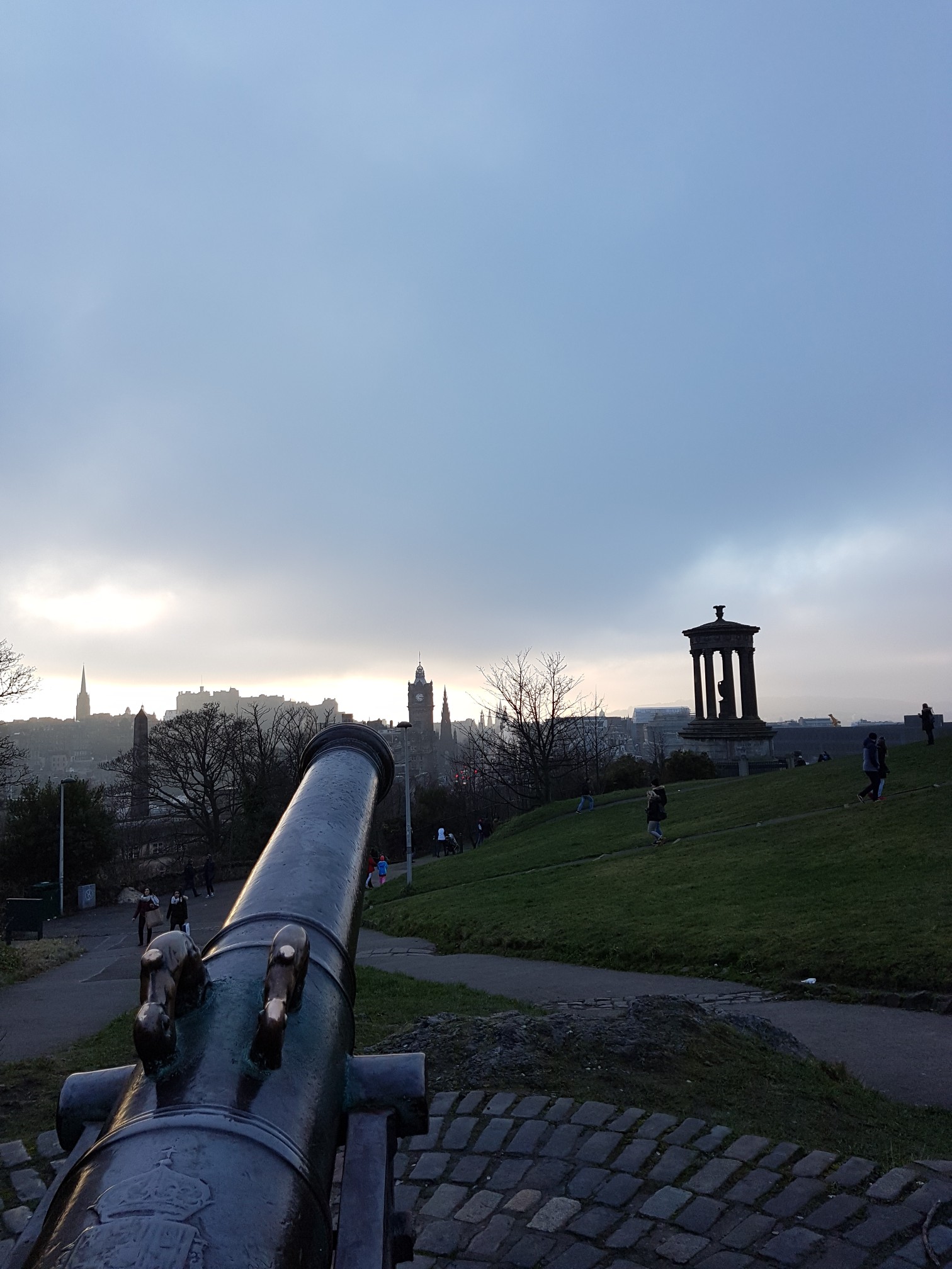 It wasn’t long till we were up on to the next hill with views over the city and it’s chimneys throwing smoke out into the sky with orange glints of light between buildings. Up here we could see over to Arthur’s seat and there was information on the volcanic nature of it and the hill the castle was built upon. There were a few bits to see up here so we walked around the summit before descending back down into the capital.