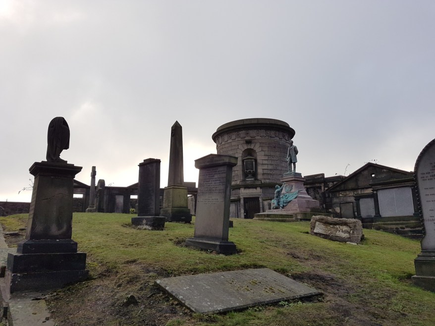From here we took the main thoroughfare up towards calton hill. On our way we stopped off at a high walled graveyard as the clouds darkened the sky we strolled past old tombs and moss covered graves. It was all very creepy and got us ready for our ghost tour later.