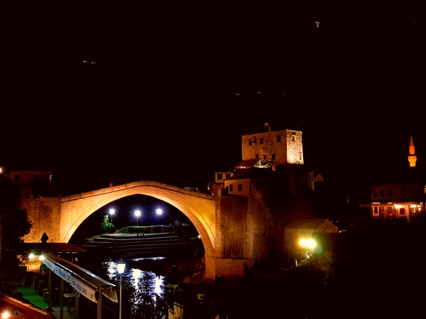 You could see the beautiful minarets peaking out from the rooftops all over the place as we walked along the main street. Here it was full of old wooden turkish looking stalls lining the path, a throwback to the Ottoman empire that ruled Bosnia for 500 years. We continued until we came to a stunning view of Stari Most, the old bridge that was bombed by the Croatians in the 90s war. It had lasted from the 16th century until that fateful day but was rebuilt after the war with some of the original stones and bricks.