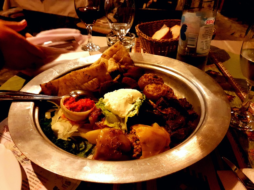 We walked over the bridge which had a very polished floor, it was actually quite slippery! Navigating our way down we found a restaurant right in front of us that did a national Bosnian plate for 2. We went for it and sat outside with a fountain trickling in the background and lots of foliage…it was very pretty.