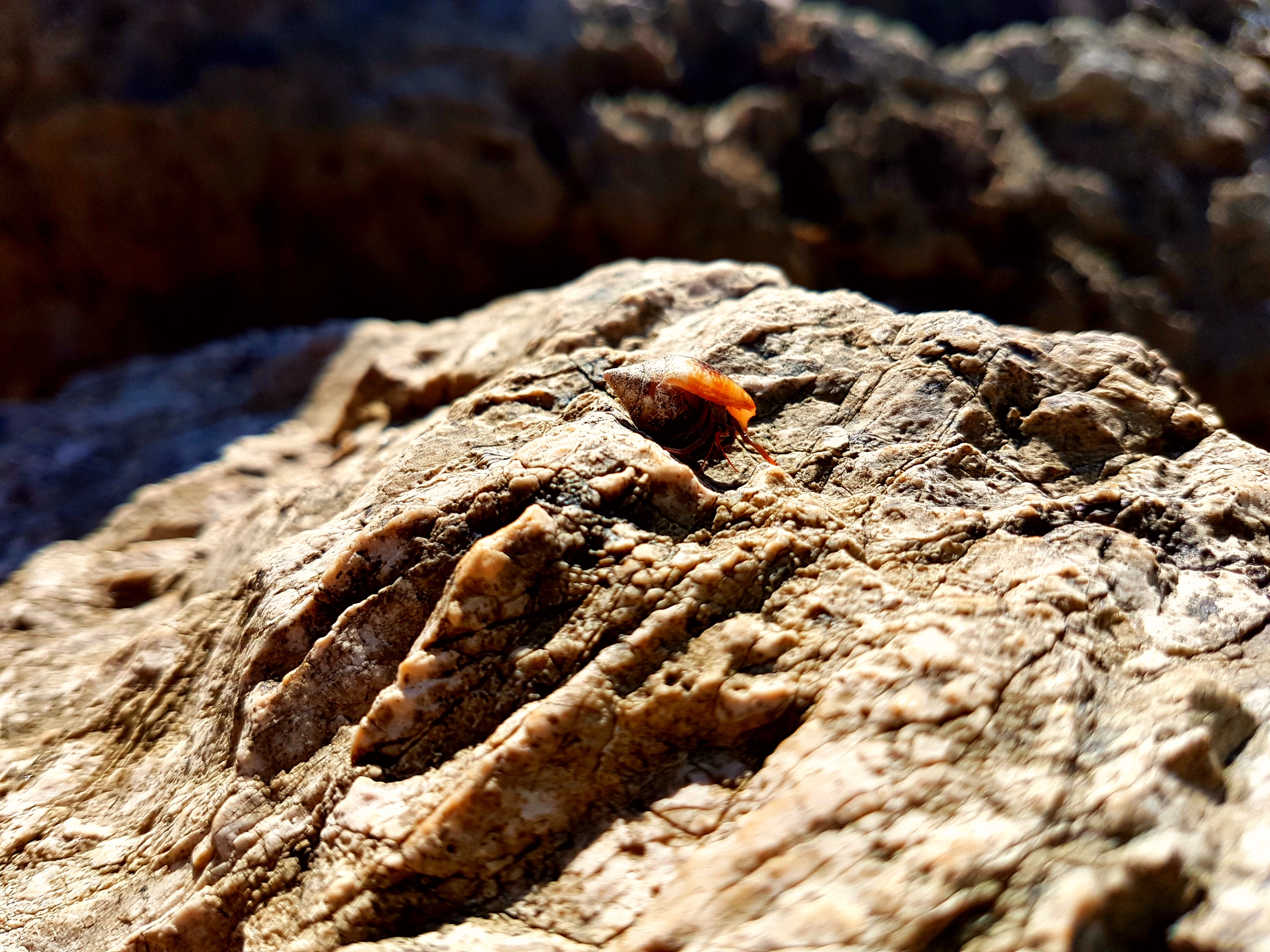 There wasn’t a soul to be seen as we sat on an old concrete jetty and marveled at the amount of marine life we could see. The sun was out again and the water glistened as we dumped our bags and walked around to the beach, climbing over rocks and even finding some hermit crabs!