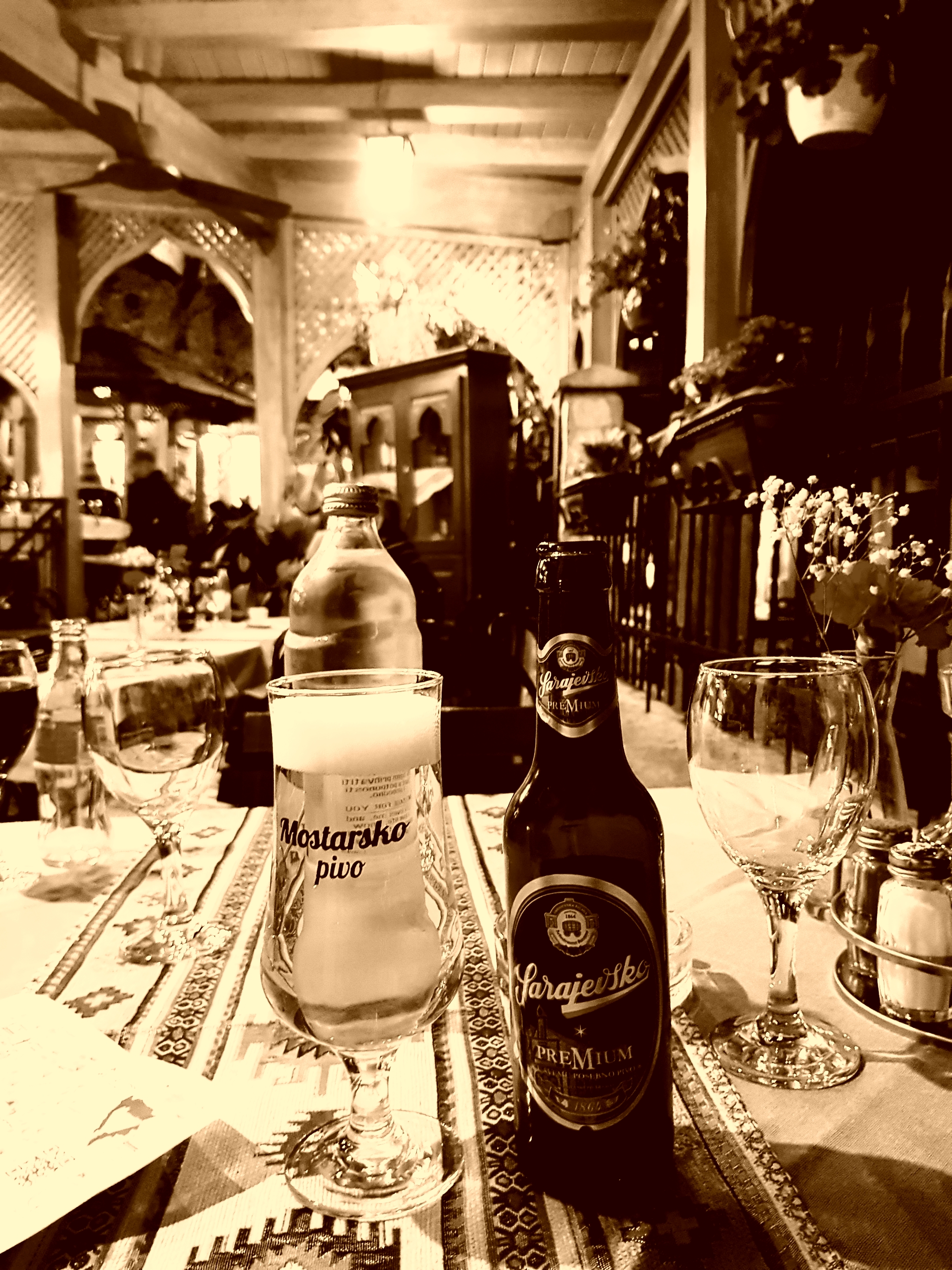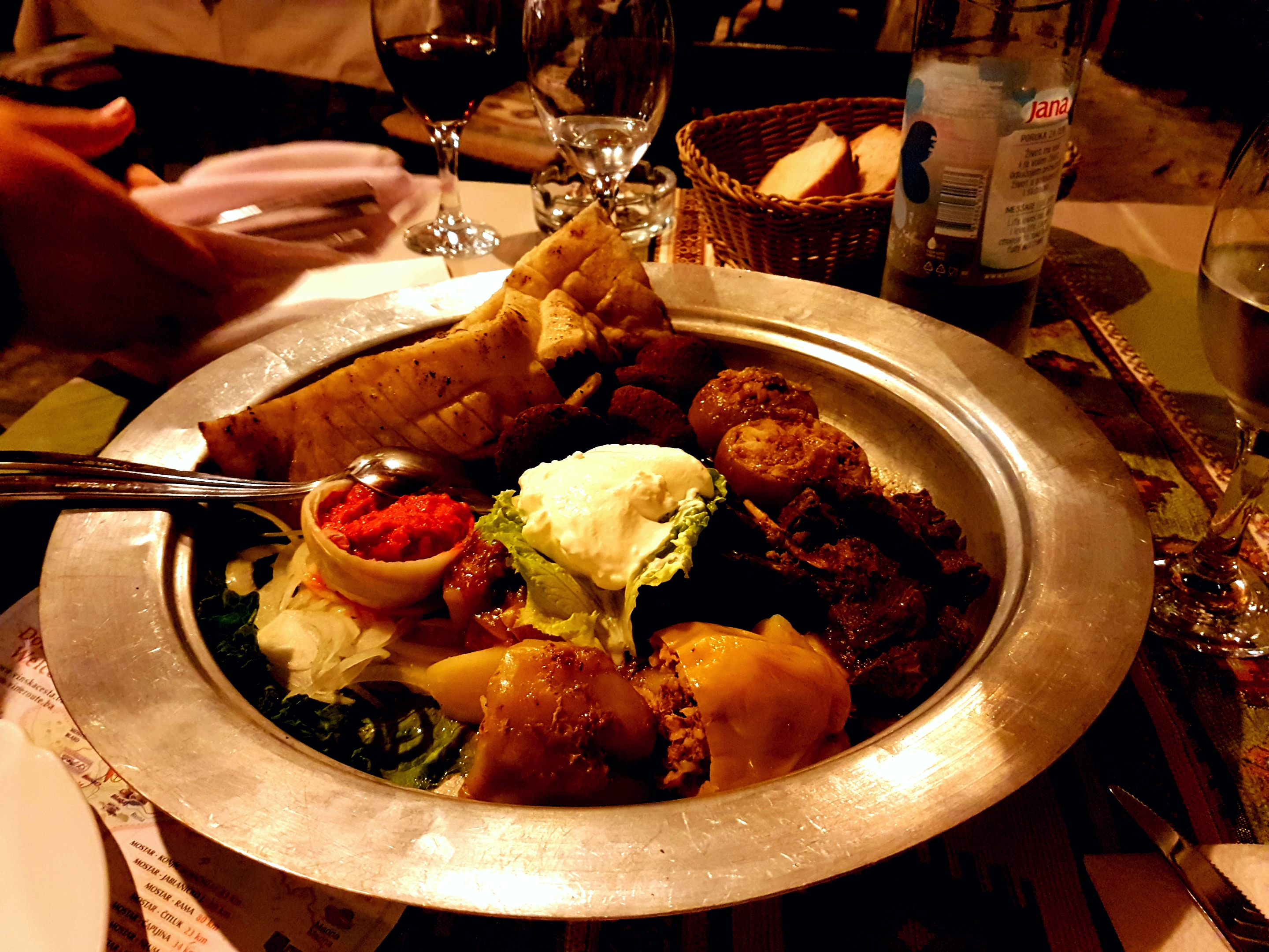 We walked over the bridge which had a very polished floor, it was actually quite slippery! Navigating our way down we found a restaurant right in front of us that did a national Bosnian plate for 2. We went for it and sat outside with a fountain trickling in the background and lots of foliage…it was very pretty.
