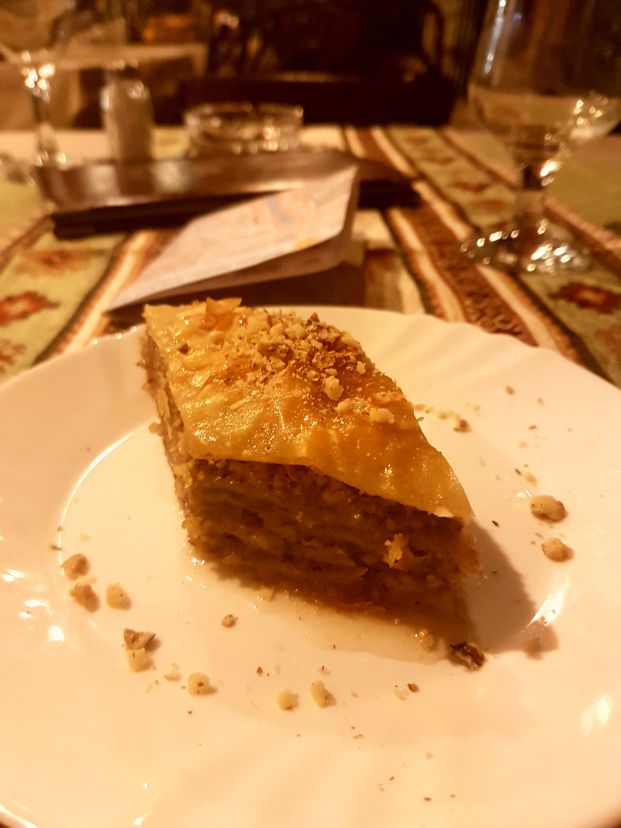 It was almost too good as we had cream cheese and Ajvar, a red pepper based dip to go with it. We were absolutely stuffed and had to wait at least 20 minutes before we ordered baklava, the syrup soaked Turkish pastry filled with chopped nuts.
