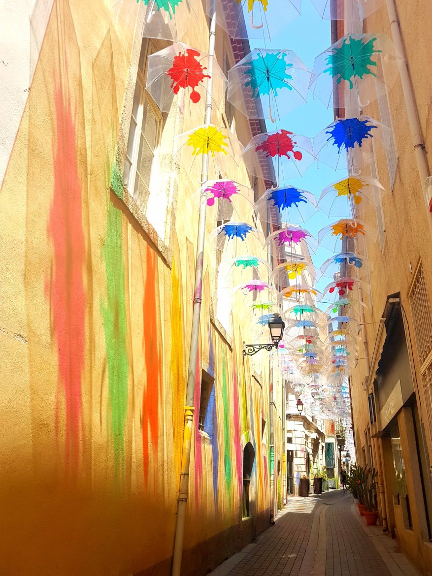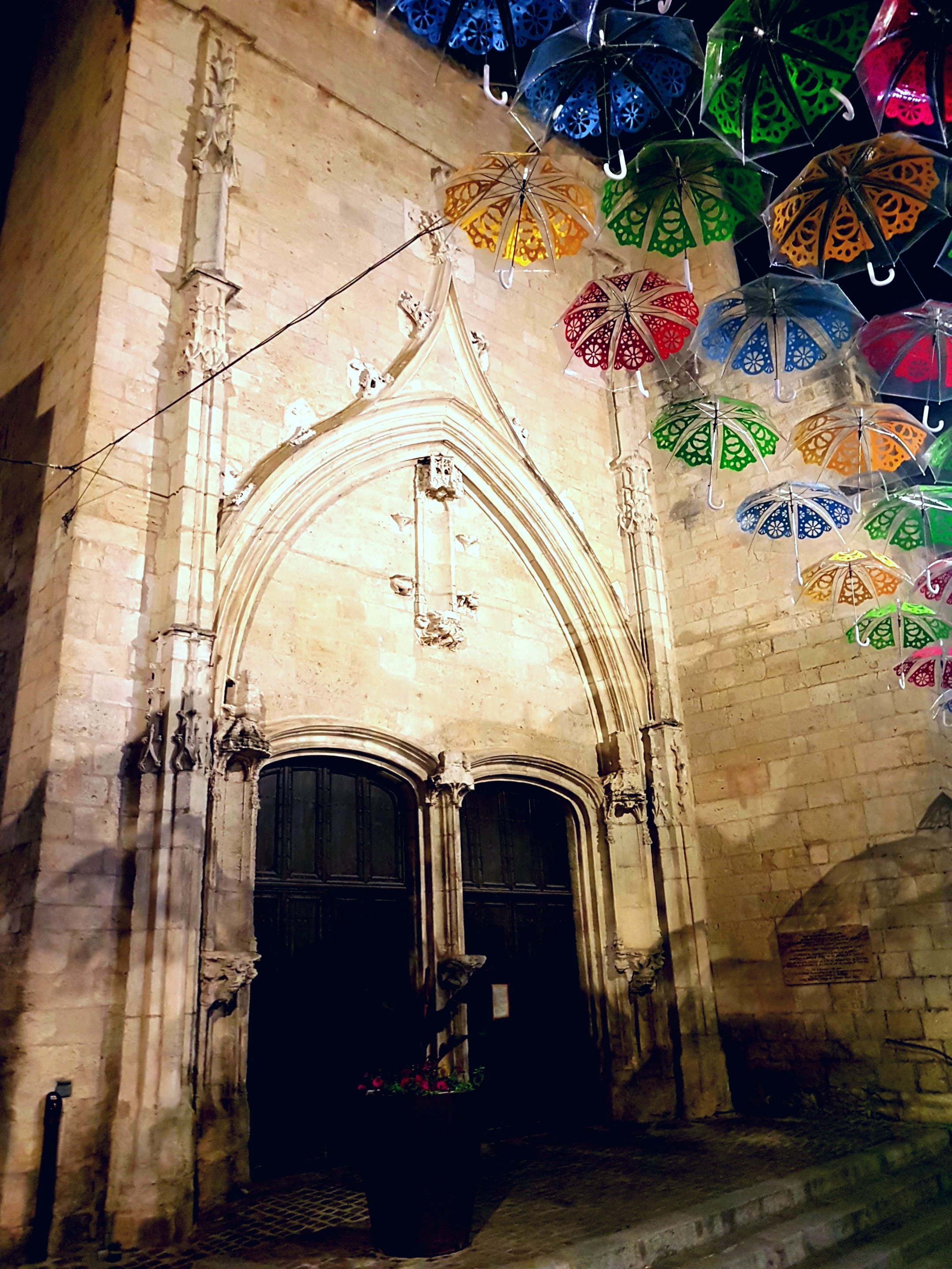 Oh I forgot to mention Beziers is located on a big hill, so lots of steep streets winding up to the cathedral. I took one of these streets to a pretty square with some nicely lit up buildings and, following a little street found myself walking beneath lovely coloured umbrellas. It was getting late now and being on my own I struggled finding somewhere to eat. So I walked back to the hotel and got some stuff from the vending machine… so spent the night eating and organising my full day in Beziers tomorrow.
