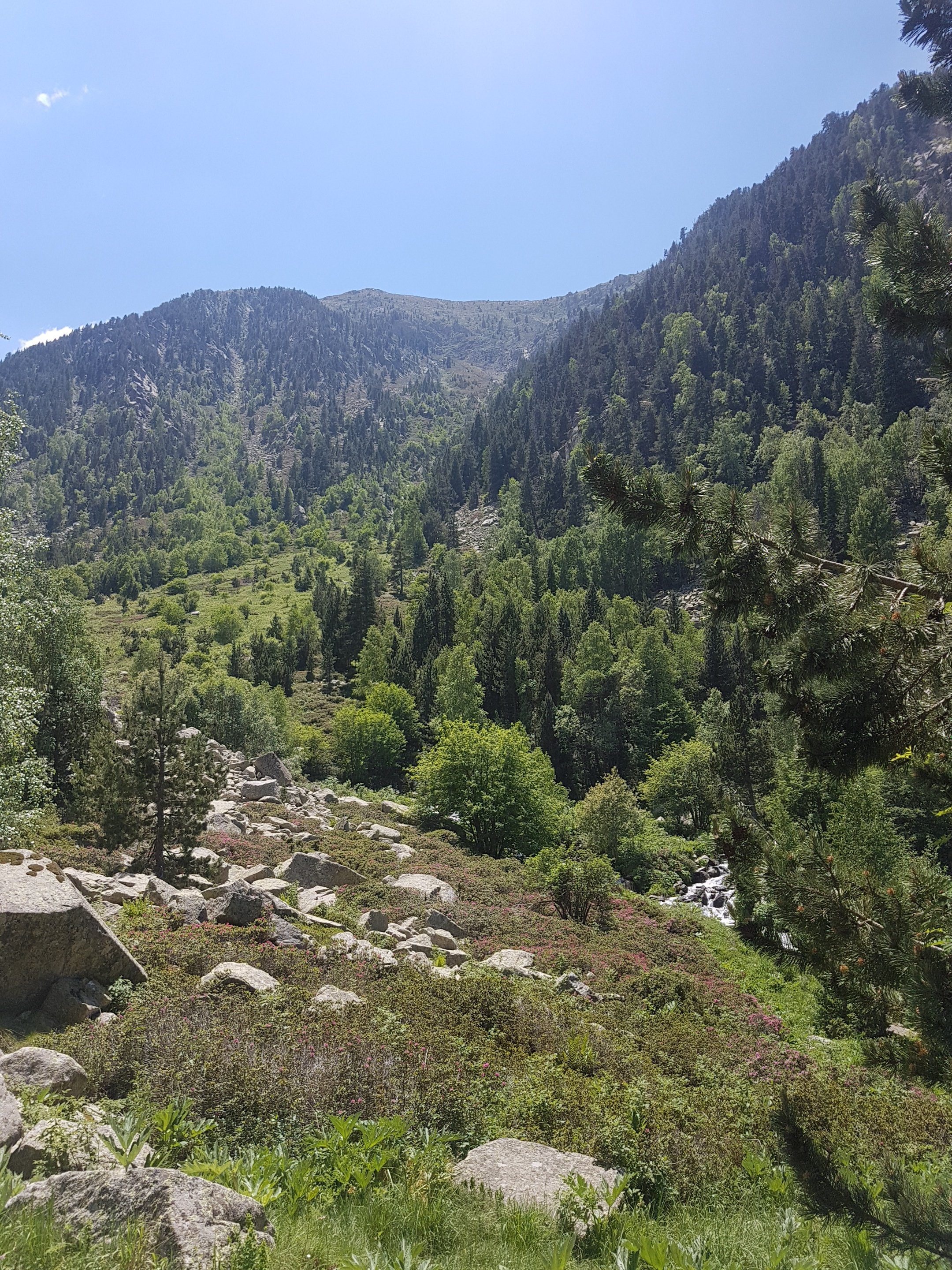 The peacefulness of it all was great but by this point I had been walking for around 2 and a half hours I decided to keep hydrated by filling my empty gazpacho bottle with the fresh mountain water from the river. I wasn’t sure how much longer it was to the top, luckily Google maps was working up here! It said about 2 km longer but now it was getting steeper. I made my way (slowly) up, following the river before emerging into a beautiful mountain meadow.