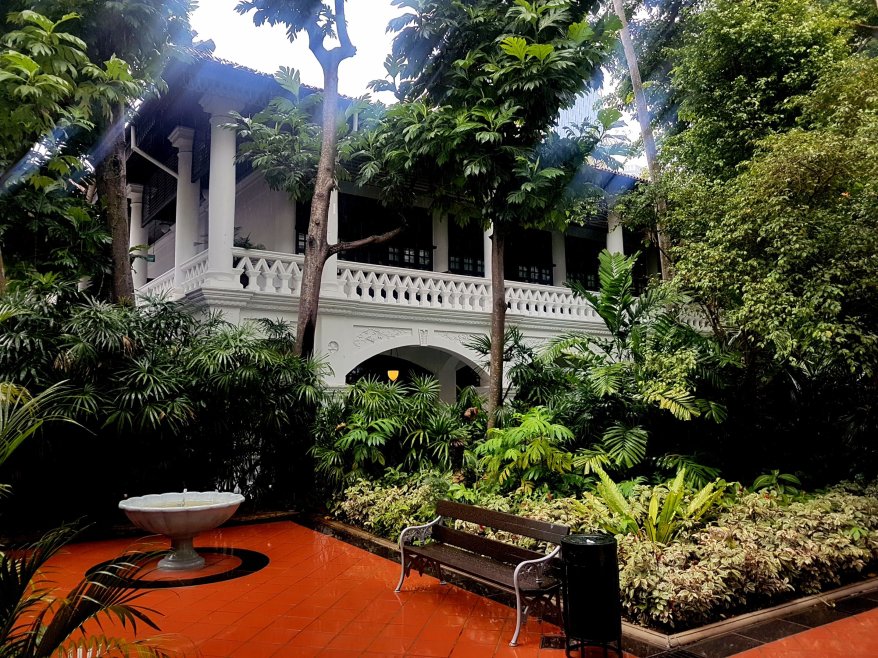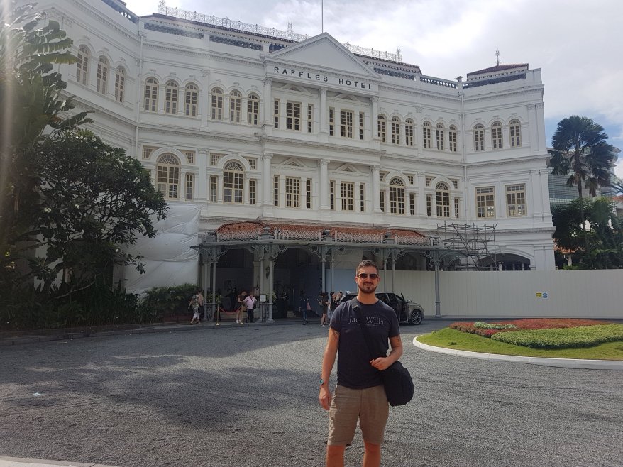 Taking shelter I took some Singapore dollars out and we hid in a little cafe having coffee and cake to perk us up. The rain soon subsided and we found ourselves a few minutes walk from the famous Raffles hotel. Raffles has existed here since Singapore was just an up and coming colonial outpost and is a Singaporean institution.