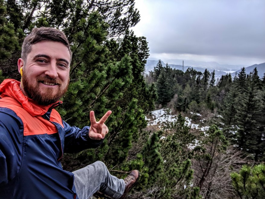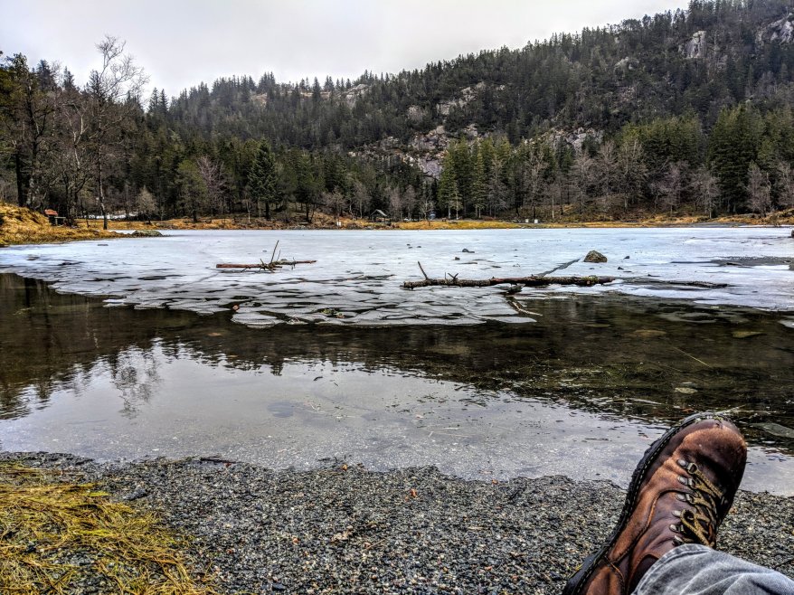The lake was frozen over which was cool, and there were some awesome places to stop, one where I dangled my legs above the forest below!
