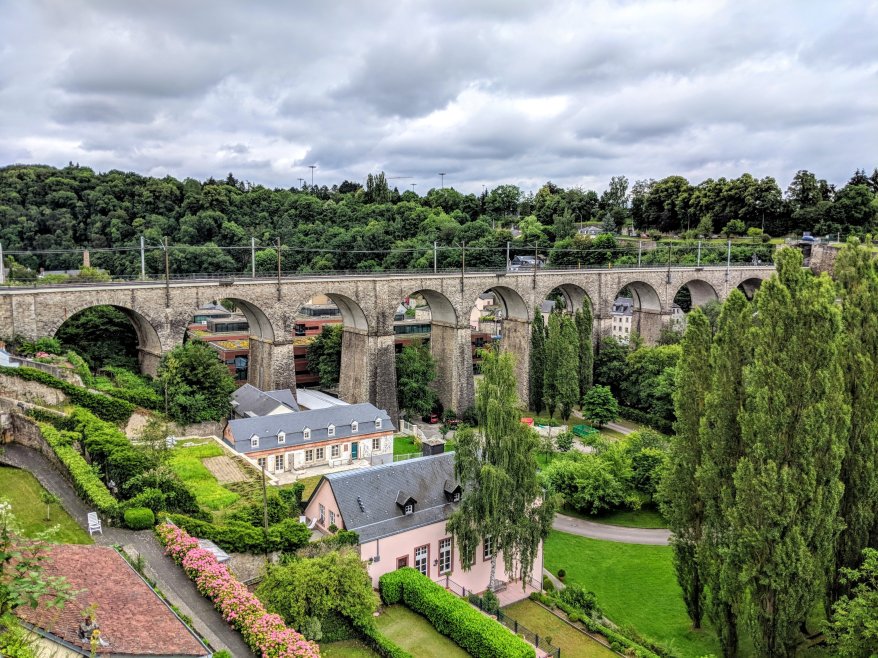 However there are plenty of old interesting buildings to look at, like the notre dame cathedral and pretty squares to stop for a coffee or beer.One of the most beautiful parts of the town looks out towards their most famous bridge the Adolphe with the Musee de la Banque just peaking out from behind some trees.I think Luxembourg is one of the greenest Cities I have ever visited. I descended back down into the valley to wander around the park and enjoy the cool evening after the heat of the day.