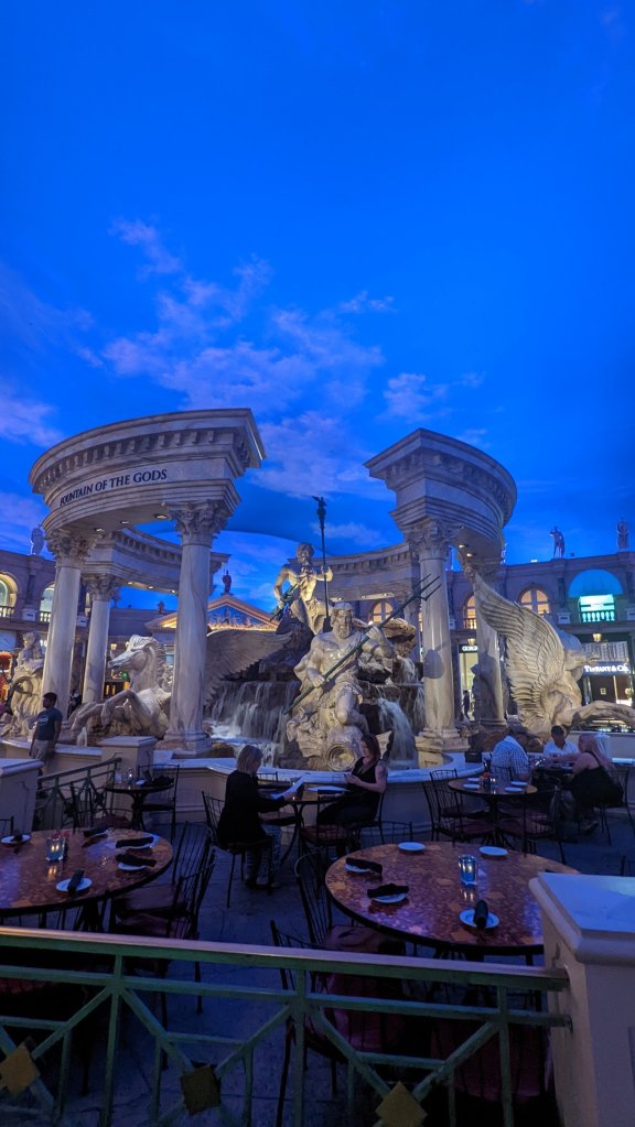 I grabbed a quick bite in Nacho Daddy, mainly chosen becasue of the name. Then wandered up the strip towards Paris hotel, being greeted by a replica Eiffel Tower. After being mesmerized by the lights and the views I crossed over to check out the Bellagio. The famous Bellagio fountain is right in front of the hotel. More than a thousand fountains dance to a music and light show, It’s pretty iconic and they go off every 15 minutes between 7pm and midnight.