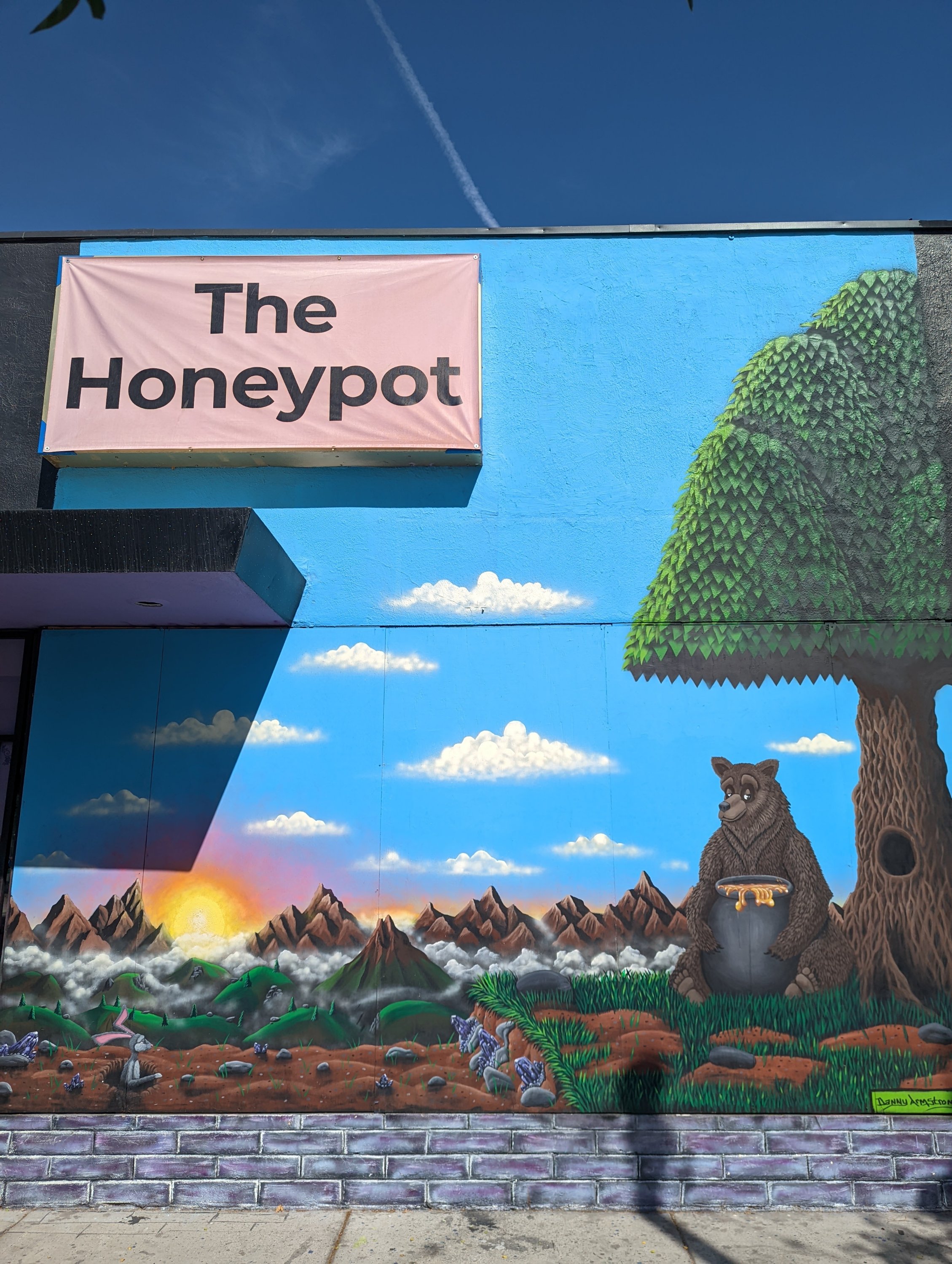 It was fun to sit and watch the LED light show with a drink in one of the bars. It was also a great spot for people watching. I walked the length of the street and stopped off for some snacks. On the bus journey up I had noticed the Las Vegas arts district which looked interesting. So I headed back and jumped off the bus to check out all the amazing street art. There was even a rainbow crossing which I always love finding. I could have wandered around here for the whole afternoon, there were some nice looking breweries and restaurants too. Instead I picked up some pizza slices with chilli honey and wandered back down towards the main strip.
