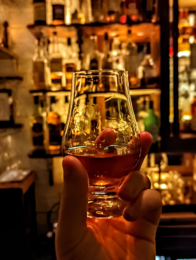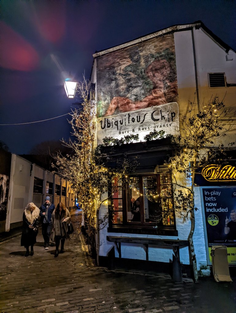 I stumbled across the road and managed to find a space in the Ubiquitous Chip, a very cute little old fashioned pub. There is a restaurant attached that sounded nice too. I had a Laphroaig 12 yr old and settled in to plan my next steps.