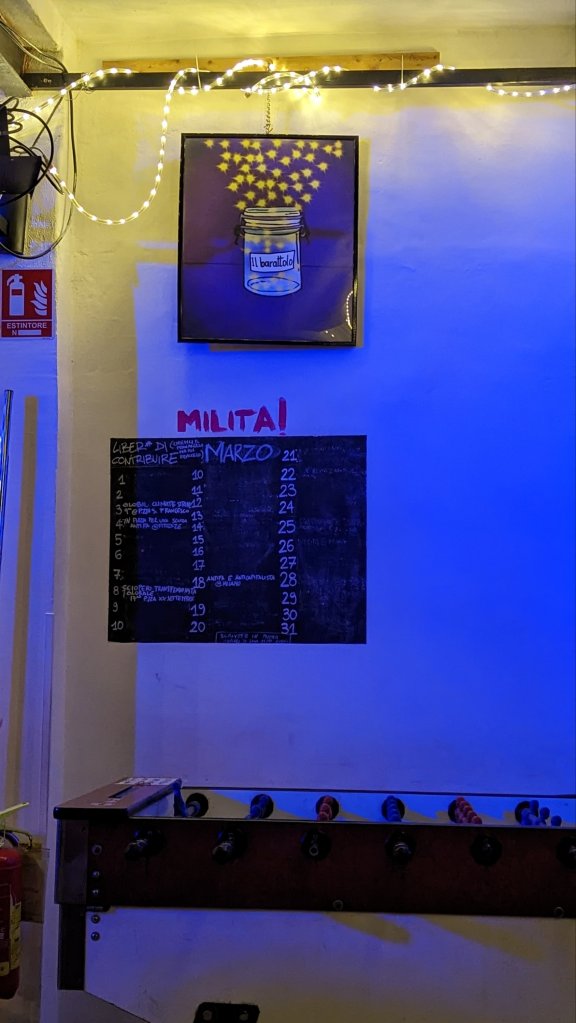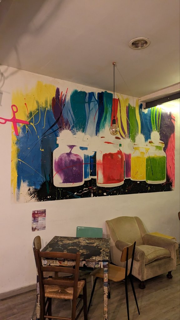 I found out it opened at 5pm (It was a Wednesday) and it was just past 5 so off I toddled. It’s small and gritty which makes a change from a lot of gay bars. I liked it, there were some cool murals and a calendar for leftist events! A nice glass of ice cold Vino Blanco later and it was time to leave. So I walked to Bologna Centrale and took the Marconi express back to the airport.