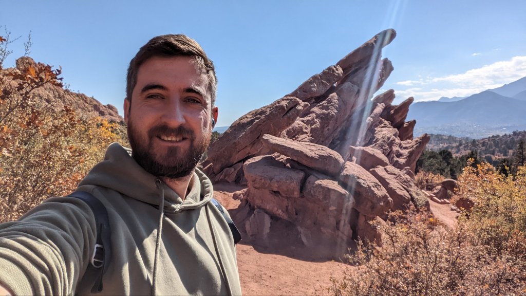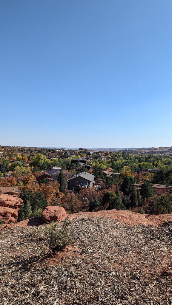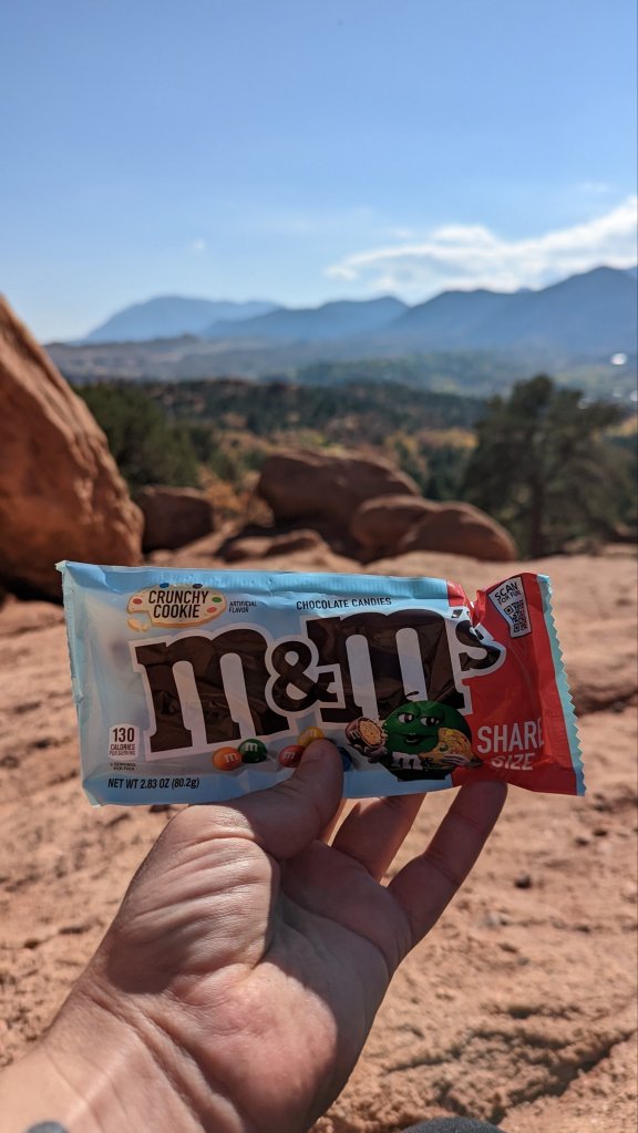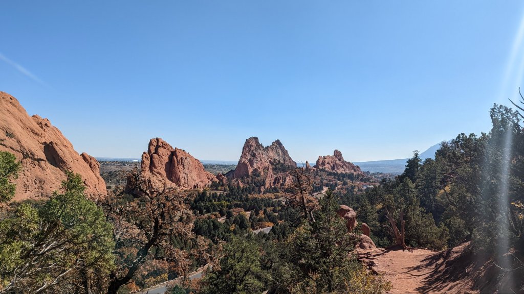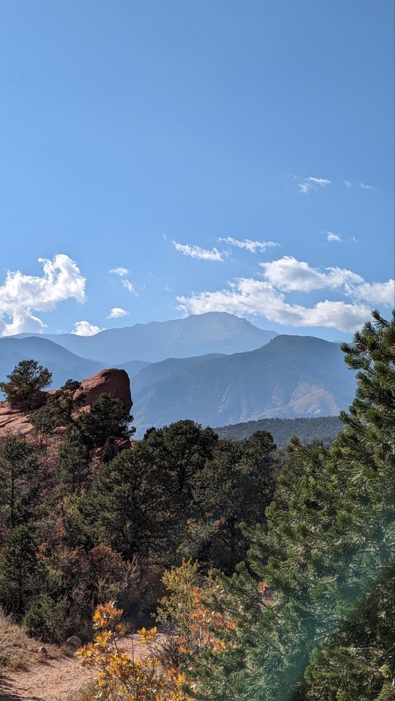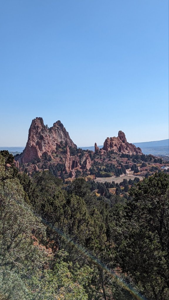 I passed some amazing rock formations, the layers and colours are insane. Then I started getting the views over towards Pikes Peak, the mountains were coloured blue by the haze, stunning. I kinda stumbled upon The Siamese Twins, two little pinnacles joined by rock, this was a great spot to stop for some snacks.